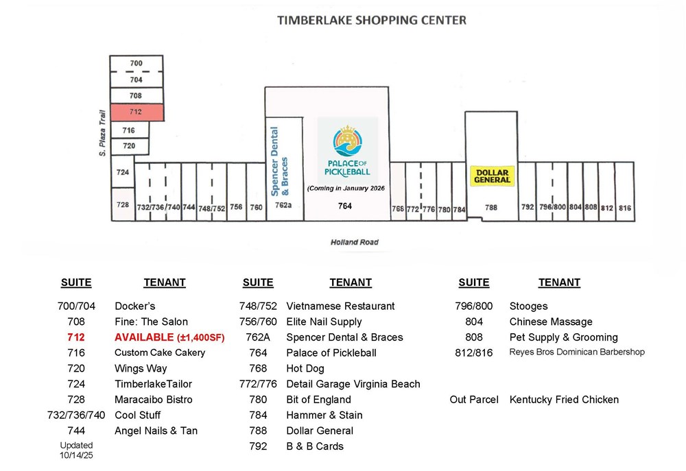 Located at the intersection of Holland Road and S. Plaza Trail, the Timberlake Shopping Center is a neighborhood shopping center ideal for prime office, service and retail shops. Join Palace of Pickleball, Dollar General, Spencer Dental & Braces, Pho 78 and Maracaibo Bistro.